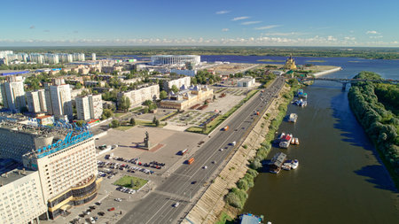 Nizhny Novgorod. Lower Volga embankment. Overview photo from the drone. Summer Sunny day