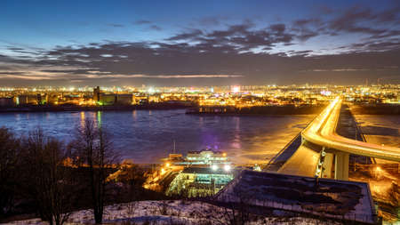 NIZHNY NOVGOROD, RUSSIA - MARCH 15, 2020: Night view in Nizhny Novgorod after sunset. Bridge with illumination through the big river Oka.