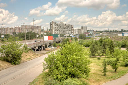 Kemerovo, Russia - June 24, 2021. Suburban village houses on shore and multi-storey residential buildings behind a forest on a hill, in foreground a road bridge across the Tom River, selective focus