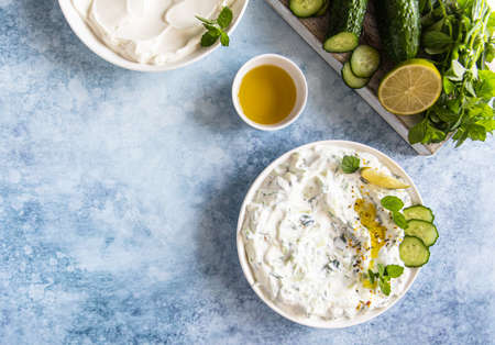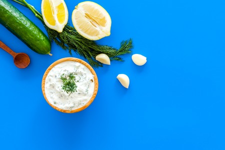 Preparing Greek cucumber yogurt sauce. Bowl with yogurt near greenery, cucumber, oranges, garlic on blue kitchen desk top view copy space