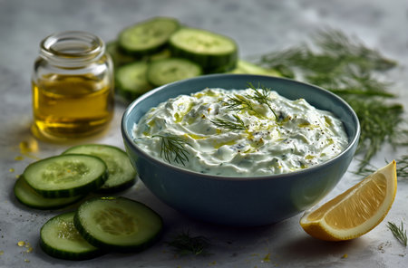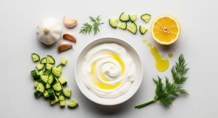 Creamy greek yogurt dip with olive oil and dill, surrounded by fresh cucumber, lemon, and garlic cloves on a light background. perfect for healthy snacks or appetizers.