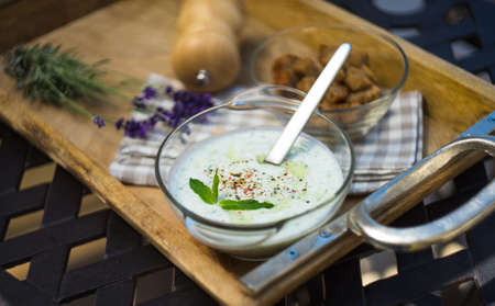 Cucumber yogurt in glass bowl