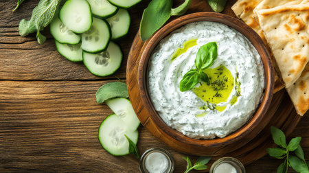 Traditional Greek Tzatziki on wooden table