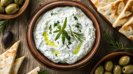 A vibrant yogurt dip garnished with fresh herbs, served with olives and bread. Perfect for appetizers or healthy snacks at any gathering.