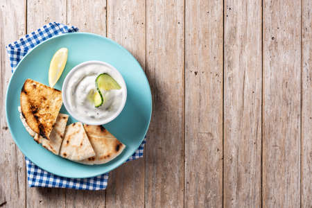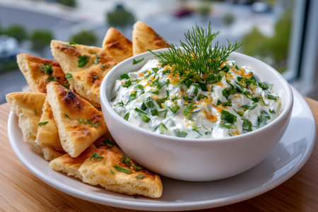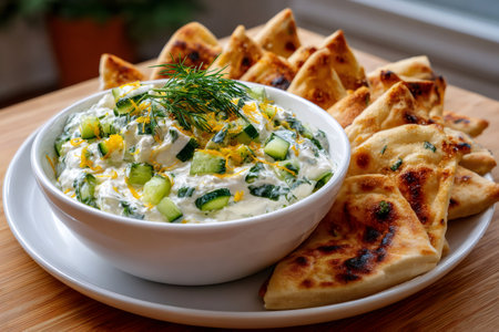 Greek tzatziki dip with fresh dill and spices served with warm pita bread