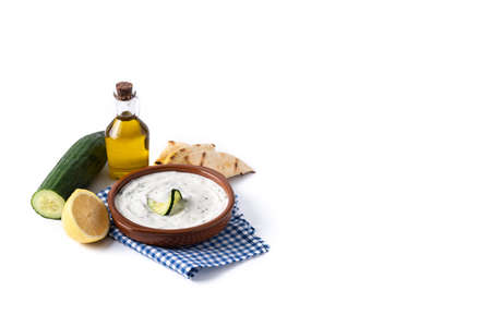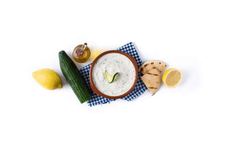 Tzatziki sauce, lemon, cucumber, garlic, parsley and mint isolated on white background