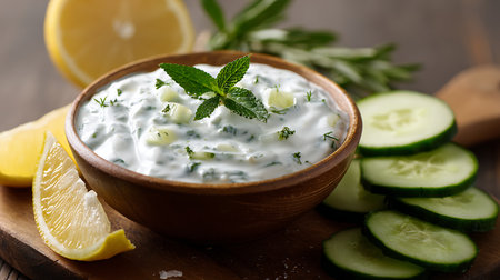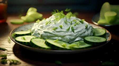 Organic vegetarian tzatziki dip with mint leaf and cucumber refreshment generated by artificial intelligence