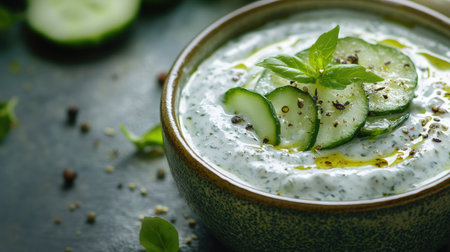 A delicious bowl of fresh cucumber yogurt dip, garnished with herbs and spices, perfect as a light appetizer or snack. A healthy addition to any meal.