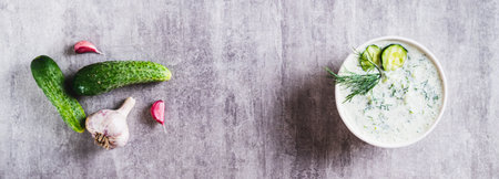 Traditional Greek tzatziki sauce in a bowl on the table top view web banner