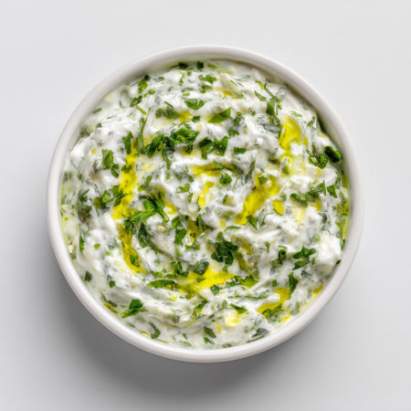 This vibrant image showcases a fresh herb yogurt sauce featuring dill and green ingredients, perfect for various dishes. The creamy texture makes it an ideal dip or dressing.