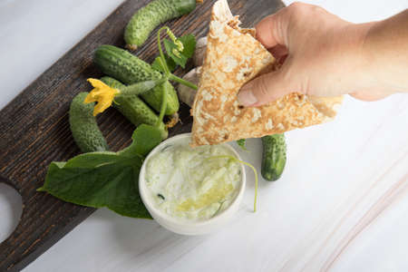 A womans hand dips pita bread in tzatziki sauce made of yogurt and grated cucumbers with garlic. National cuisines