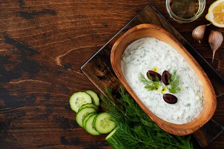 Traditional Greek sauce Tzatziki in olive wooden bowl on old rustic background. Top view.