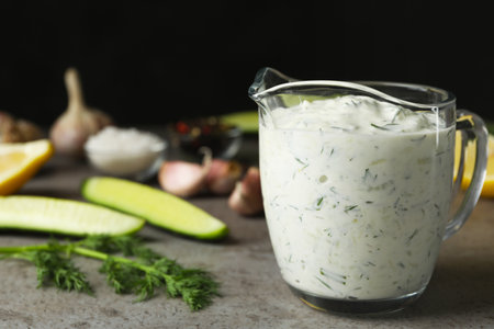 Glass jug of Tzatziki cucumber sauce with ingredients on table. Space for text