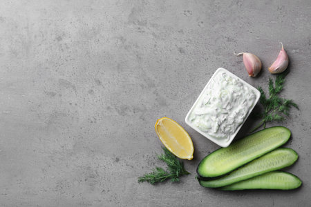 Bowl of traditional Tzatziki sauce with garlic, lemon, cucumber and dill on gray background, top view. Space for text