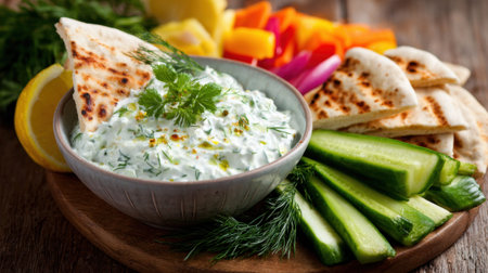 Fresh tzatziki dip with cucumbers, bell peppers, pita, and herbs on wooden platter.