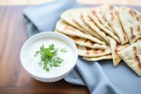 pita bread arranged around a bowl of tzatziki sauce
