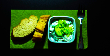 Close-up with tzatziki sauce on a slice of toasted bread, minimalist on a blue table. Delicious mediterranean snack, tzatziki sauce with toasted bread.