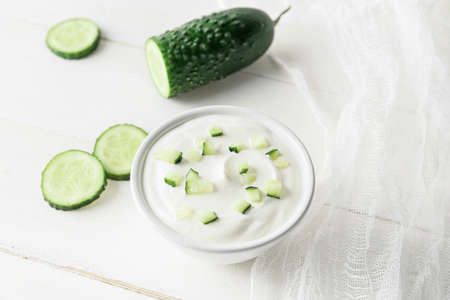 Bowl of tasty sour cream and cucumber on white wooden background