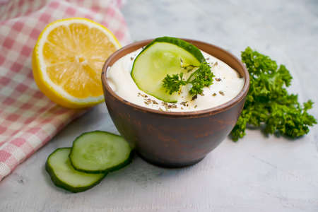 tzatziki sauce, lemon, cucumber on concrete background