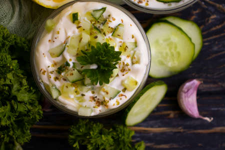 Yoghurt sauce tzatziki with cucumber, garlic, dill. Herbs and vegetables