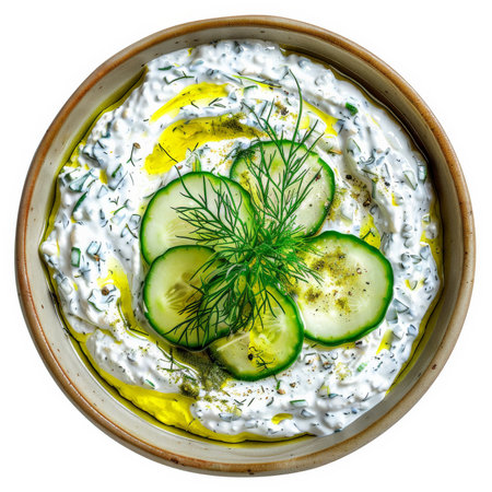 A bowl of Turkish cacik, a refreshing yogurt dip with cucumbers, garlic, and dill, garnished with a drizzle of olive oil, isolated on white background.