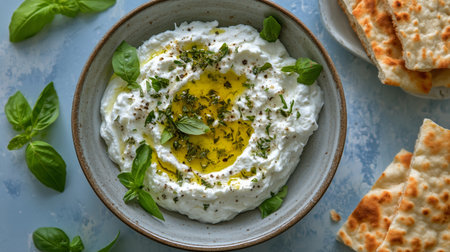 Creamy yogurt is artfully presented in a bowl, adorned with herbs and olive oil, accompanied by freshly baked flatbreads on a light-colored surface.