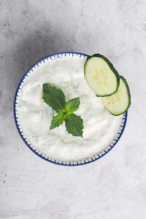 Raita sauce with cucumber, garlic and pepper. Indian Wright.Greek tzatziki sauce on a gray background. Traditional Indian raita with cucumber, greek yogurt and coriander, top view