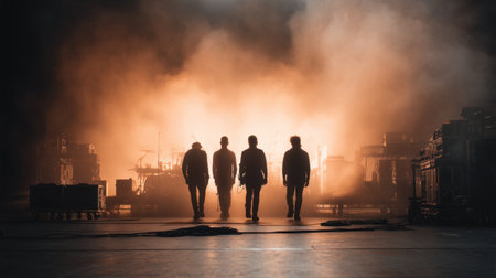 Group of musicians walking towards the stage, surrounded by dramatic smoke and lighting, capturing the intensity and excitement of a live performance atmosphere.