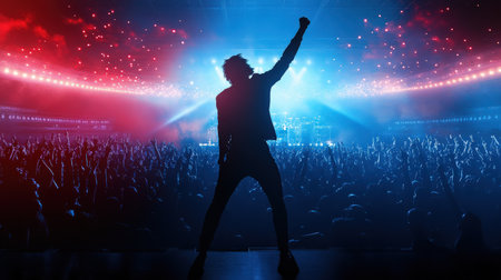Singer Performing on Concert Stage, Surrounded by Energetic Crowd and Illuminated by Stage Lights. Generative AI. high quality illustration