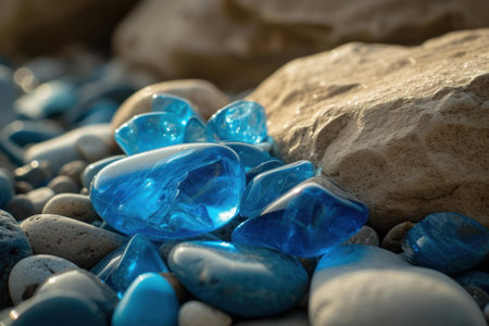 Close-up of blue glass stones nestled among natural pebbles at the beach