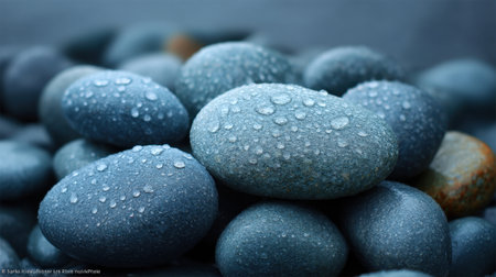 This image features a detailed close-up of smooth river stones adorned with glistening water droplets, perfect for creating a serene and tranquil atmosphere in designs.