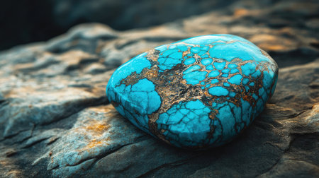 A captivating turquoise stone resting on a dark rock surface showcases its vibrant color and unique patterns, perfect for nature and gem enthusiasts.