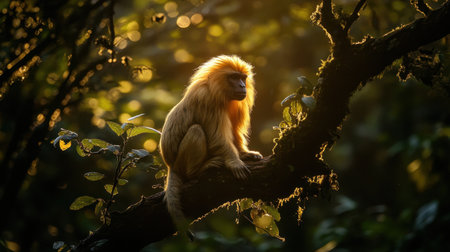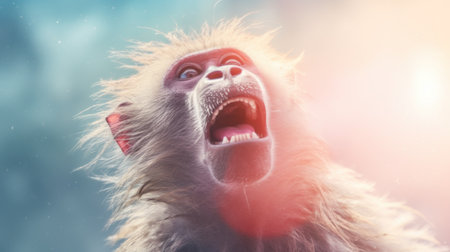 an orange and white monkey perched on a branch, showcasing its open mouth. this visually striking photograph, captured in the style of vray tracing, features a combination of dark red and light green tones. with its ultra-high definition quality, this national geographic photo captures the essence of the monkey's vibrant and explosive pigmentation, while also alluding to mythological references. ai generated