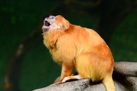 Golden lion tamarin (Leontopithecus rosalia), a species of primate inhabiting rainforests, an animal with orange fur sits on a tree branch.