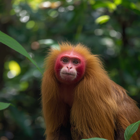 A red uakari monkey with a bald head gazes attentively in its vibrant jungle habitat, showing its striking features during daylight.