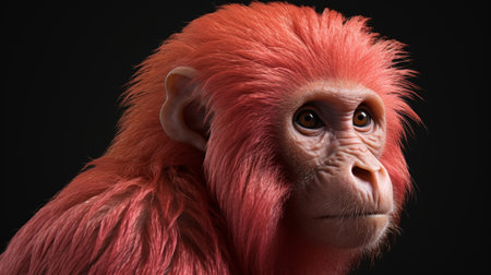 A red uakari with a bald head displays bold jungle tones while positioned against a dark background, capturing the essence of its natural habitat.