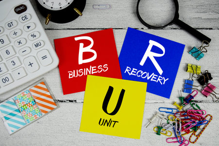 BRU Abbreviation of Business Recovery Unit text phrase of business and financial concept