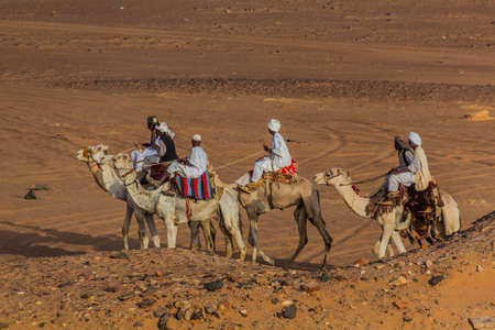 MEROE, SUDAN - MARCH 4, 2019: Locals ride camels near the pyramids of Meroe, Sudan