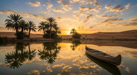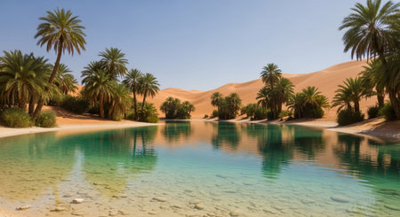 A tranquil oasis surrounded by lush palm trees sits peacefully amid expansive sand dunes. The still water reflects the vibrant greenery under the suns warm glow, creating a serene escape.