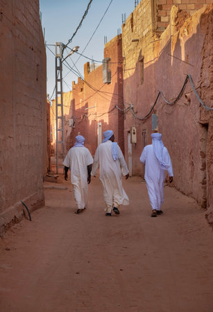 Three berber man in narrow street of oasis town Timimoun in Sahara desert, Algeria