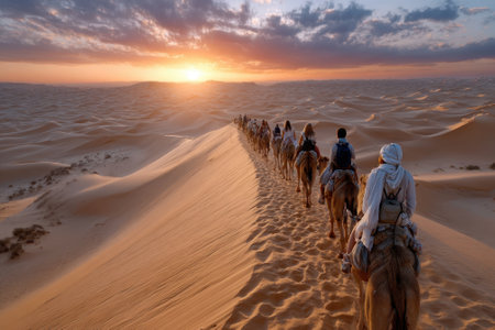 A group of travelers rides camels along undulating sand dunes as the sun sets in the distance, illuminating the sky.