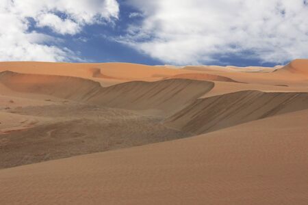 Golden sand dune 7 and white clouds on a sunny day in the Namib desert.