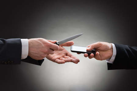 Close-up Of Businessman Hand Showing Knife To The Businessperson With Mobile Phone