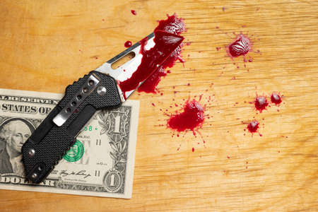 Pocket knife in bloody with one dollar and drops of blood on a wooden background. The concept of assault and robbery