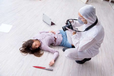Forensic investigator at the crime scene investigating woman mur