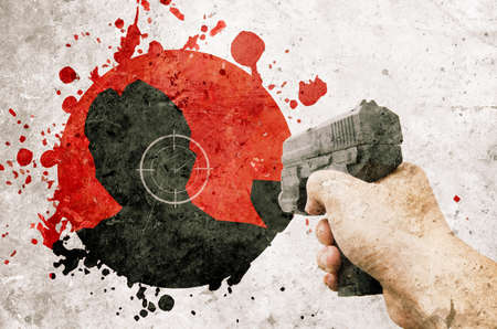 Robber or criminal is aiming with a black gun, blurry face