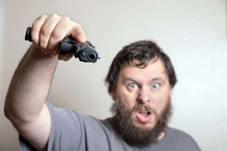 Bearded businessman with handgun against gray background