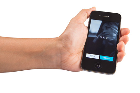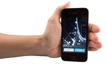 CHIANG MAI,THAILAND - JUN 04,2016 : A MAN hand holding Uber app showing on iphone 6s. Uber is smartphone app-based transportation network