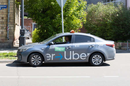 Krasnoyarsk, Russia - May 24, 2022: taxi car under the Uber logo brand on city street. The driver is waiting for the passenger in the car. Ordering a taxi via the app