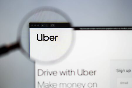 Miami / USA - 07.18.2019: Uber company website homepage. Close up of Uber logo. Can be used as illustrative for news media or other websites, good for business or marketing concept.